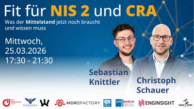 NIS2-Umsetzung, CRA-Schnittstellen und IT-Quick-Wins: Sebastian Knittler (Saphira Security) und Christoph Schauer (moreFactory) geben praxisnahe Impulse.