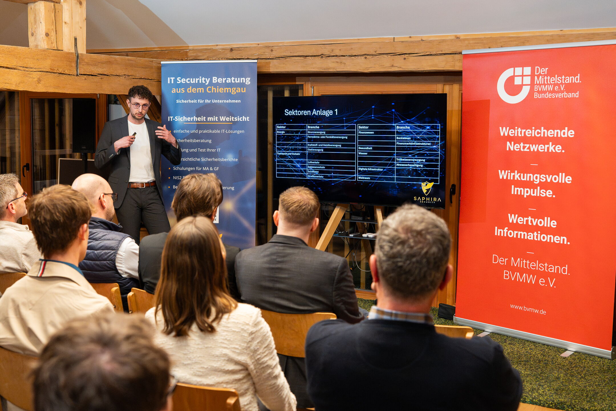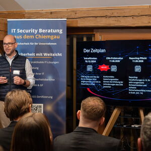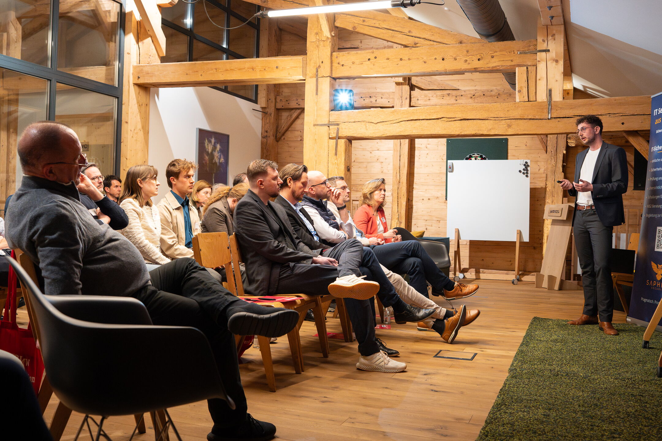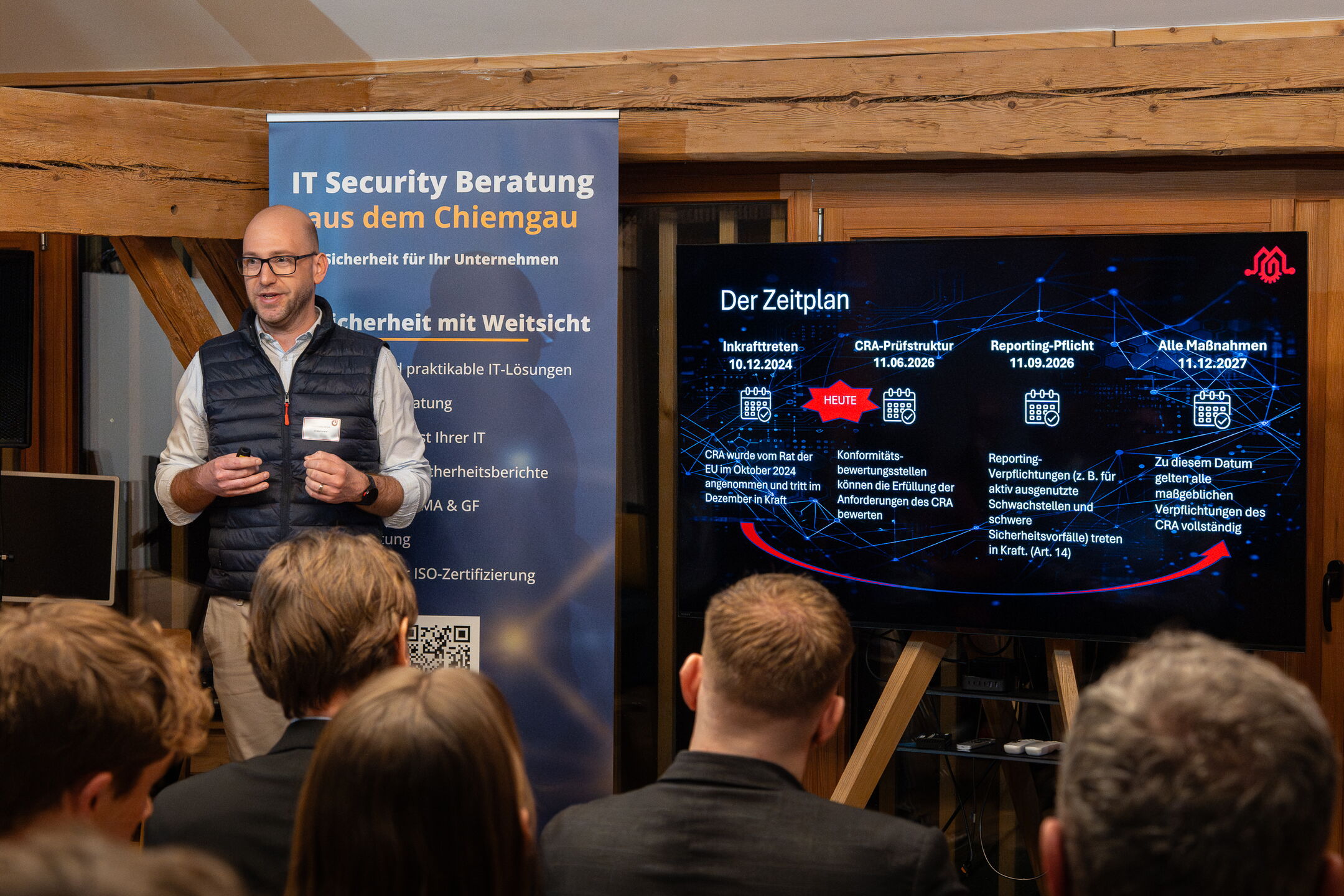 Der Abend stand ganz im Zeichen von Wissenstransfer und Austausch. In einer Reihe von Fachvorträgen erklärten unsere Referenten die Grundlagen und Hintergründe zu NIS2 und CRA. Dabei ging es nicht nur um abstrakte Gesetzestexte, sondern vor allem um die praktische Umsetzung im Unternehmensalltag: