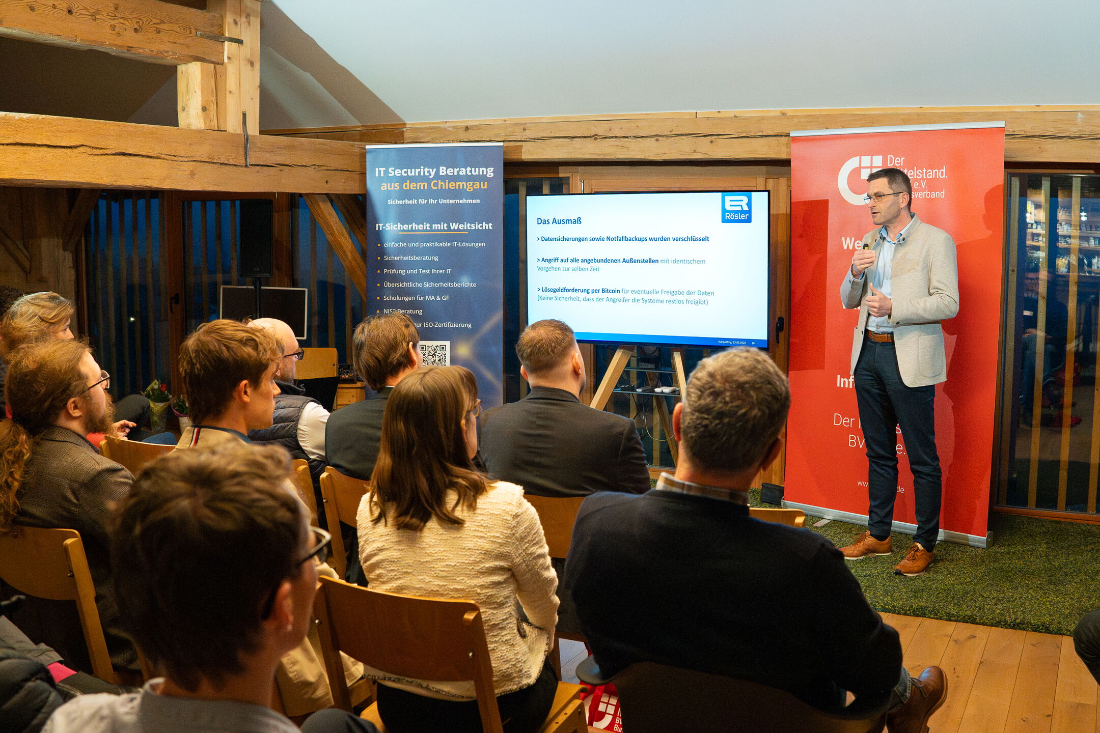 Ein Höhepunkt des Abends war der Erfahrungsbericht eines Unternehmens, das selbst Opfer eines Cyberangriffs geworden war. Der Vorstand schilderte eindrücklich, wie über Nacht sämtliche Systeme des Betriebs – von der Schließanlage bis hin zu zentralen Geschäftsdaten – verschlüsselt und unzugänglich wurden.